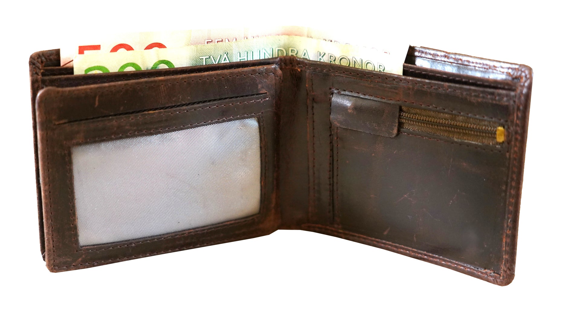 Denna plånbok med 2 sedelfack, kan ta upp till 7 kort inklusive ID och körkort, förutom myntfacket på höger sidan.